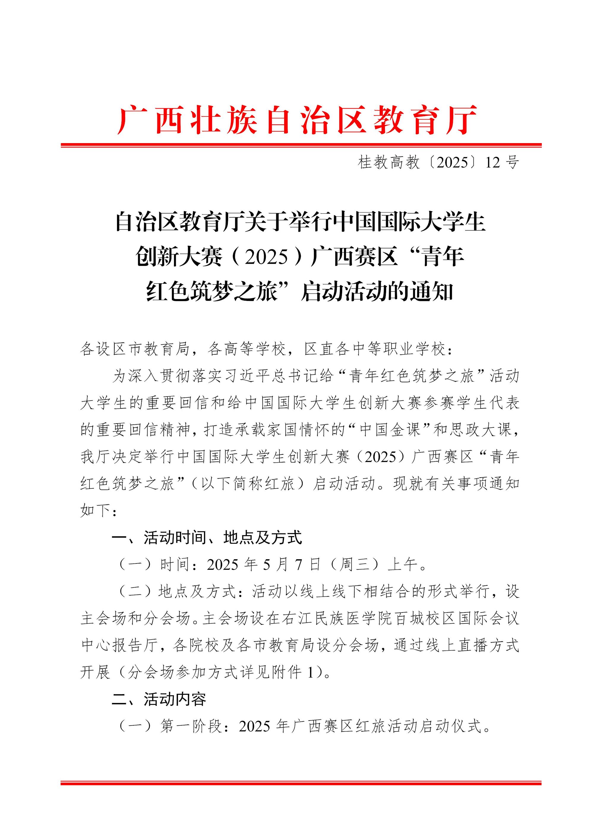 自治区教育厅关于举行中国国际大学生创新大赛(2025)广西赛区“青年 红色筑梦之旅”启动活动的通知 来源:文/蒙贵货 图/蒙贵货 发布时间:2025-10-20 12:20:35 浏览次数: 次 【字体:小 大】 桂教高教〔2025〕12号自治区教育厅关于举行中国国际大学生创新大赛(2025)广西赛区“青年红色筑梦之旅”启动活动的通知.pdf 终审:cxcyxy001 【打印正文】 相关信息