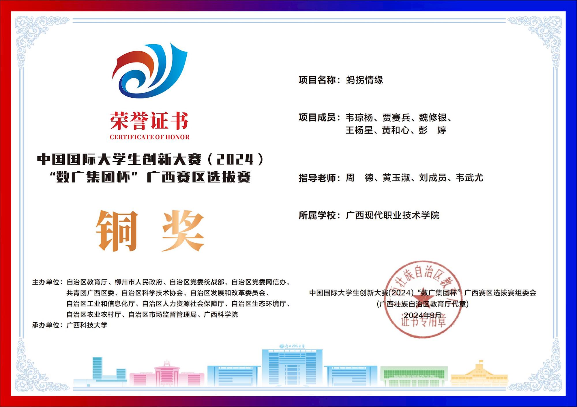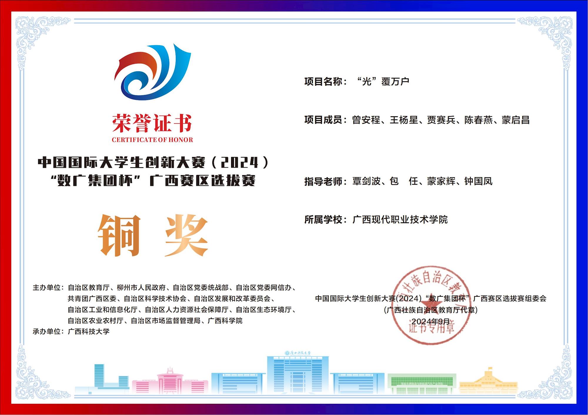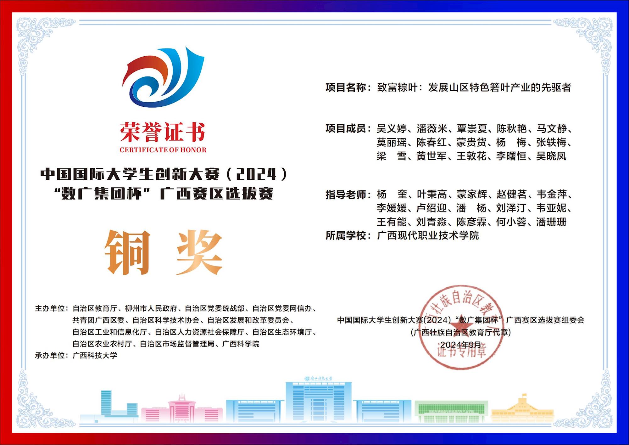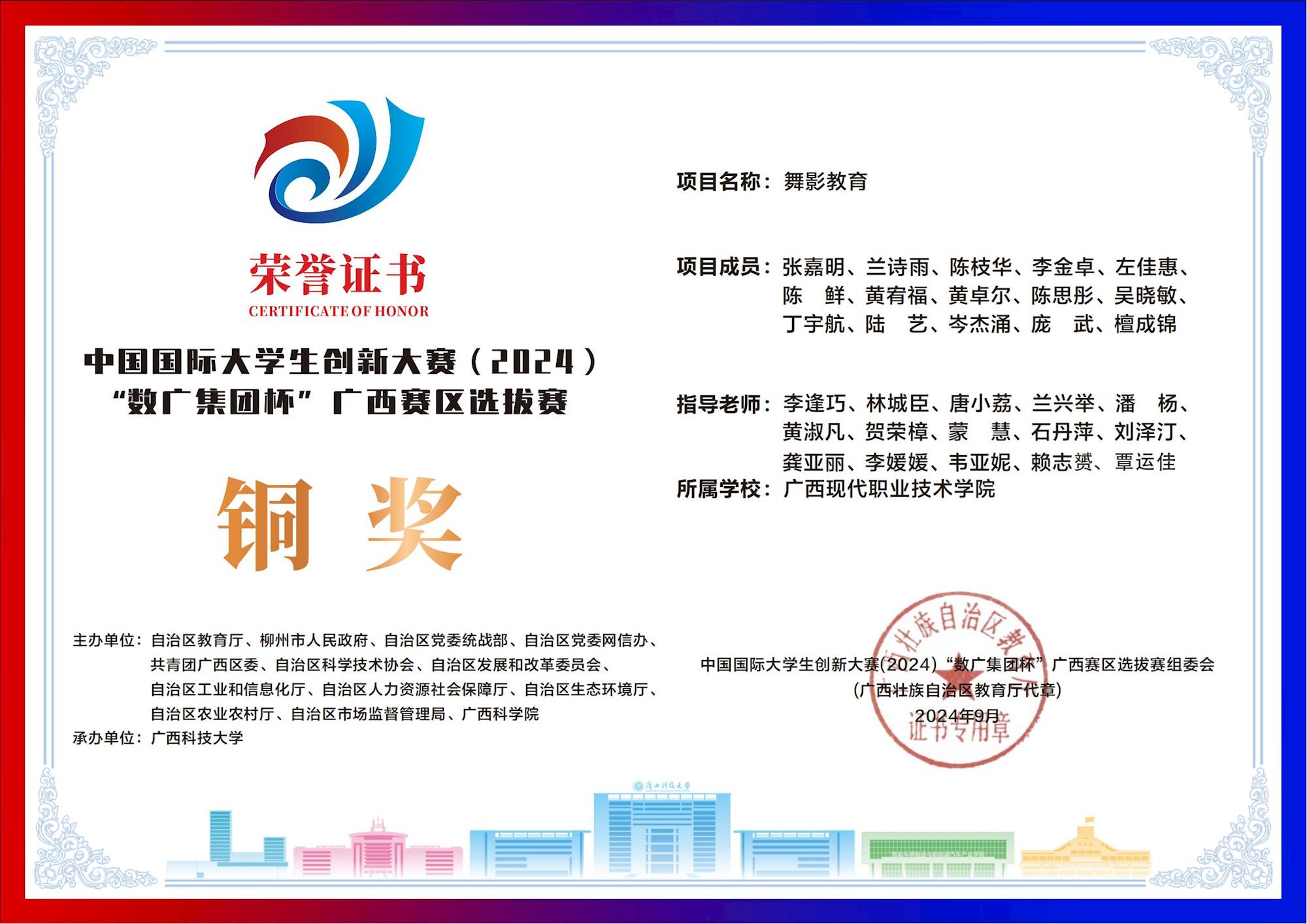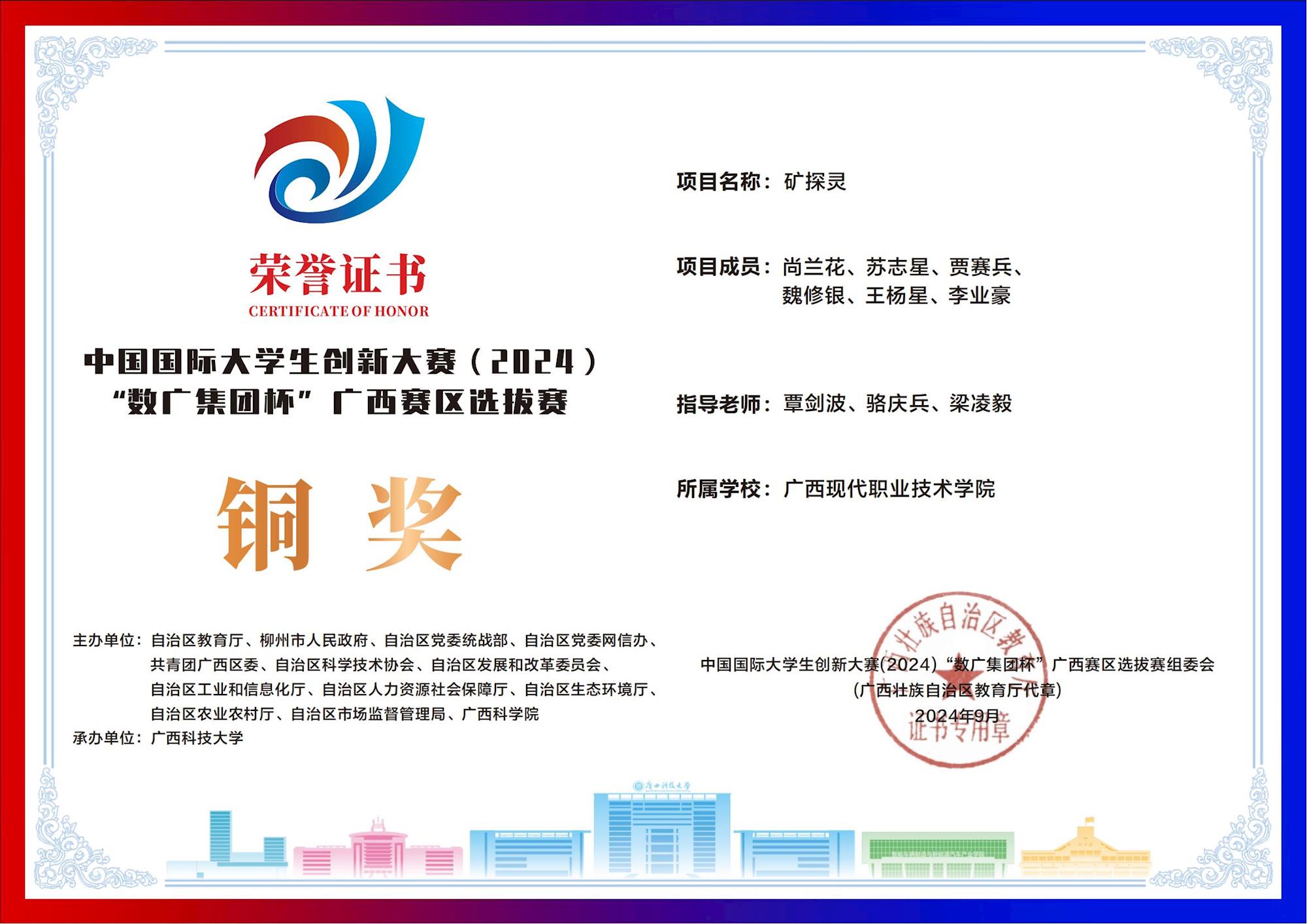 中国国际大学生创新大赛(2024) “数广集团杯”广西赛区选拔赛:我校斩获“青年红色筑梦之旅”赛道1银15铜! 来源:文/蒙贵货 图/蒙贵货 发布时间:2025-10-20 09:20:17 浏览次数: 次 【字体:小 大】 在2024年中国国际大学生创新大赛“数广集团杯”广西赛区选拔赛中,我校学子在“青年红色筑梦之旅”赛道表现卓越,斩获银奖1项、铜奖15项,以创新实力彰显职教风采! 终审:cxcyxy001 【打印正文】 相关信息