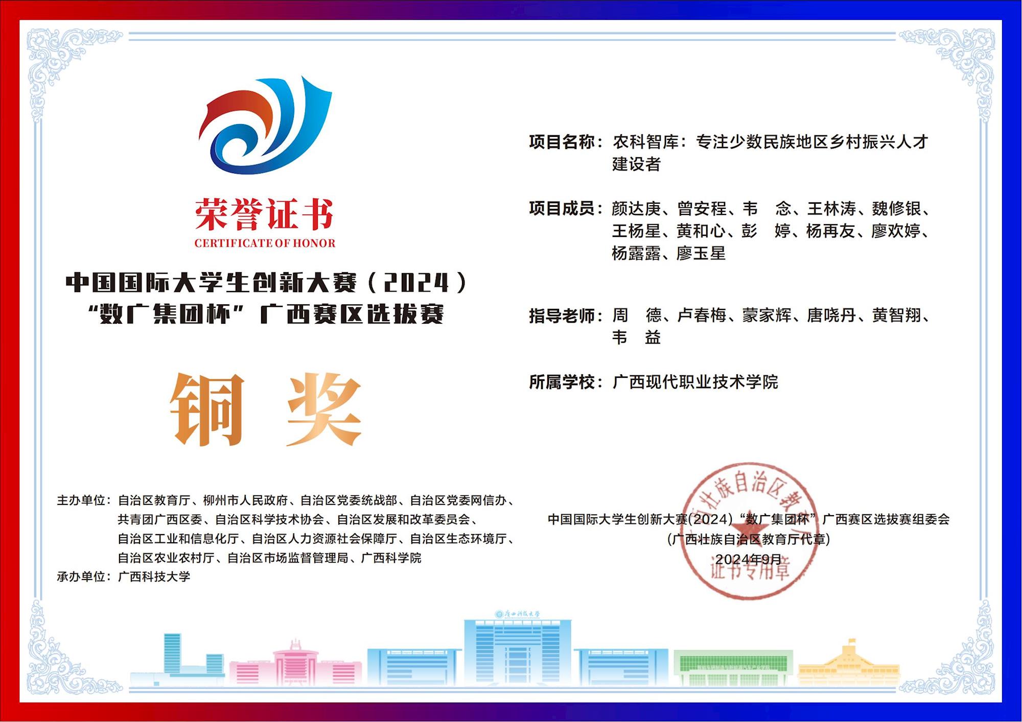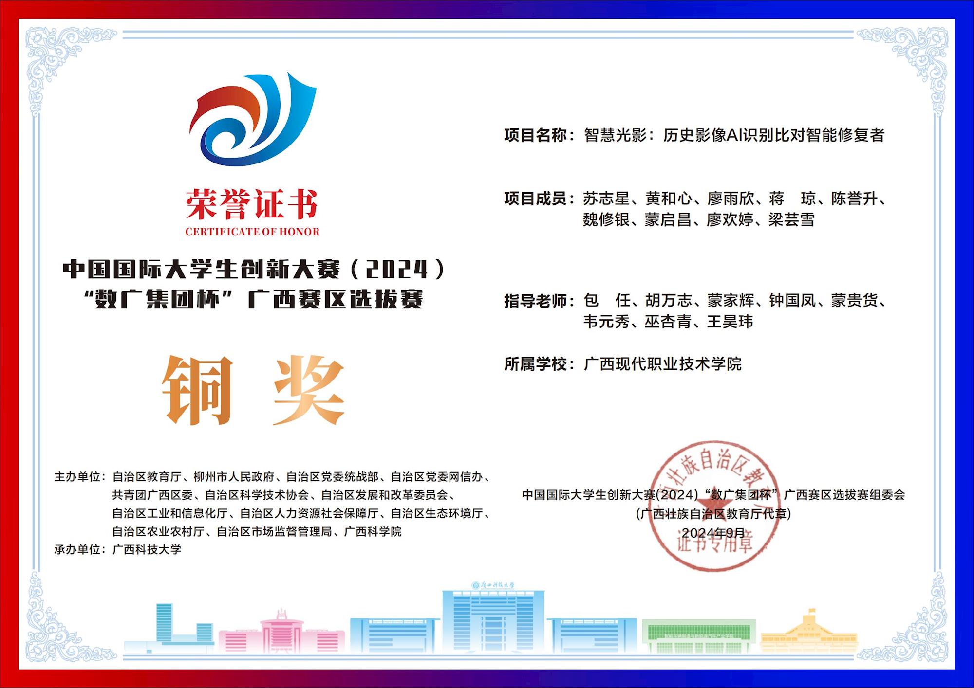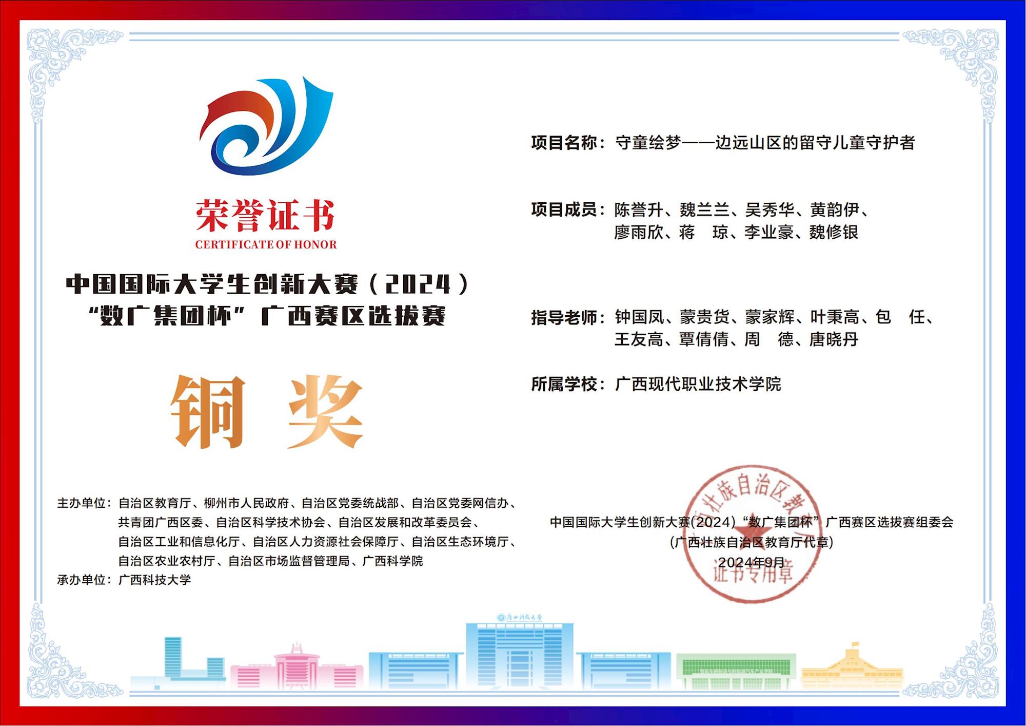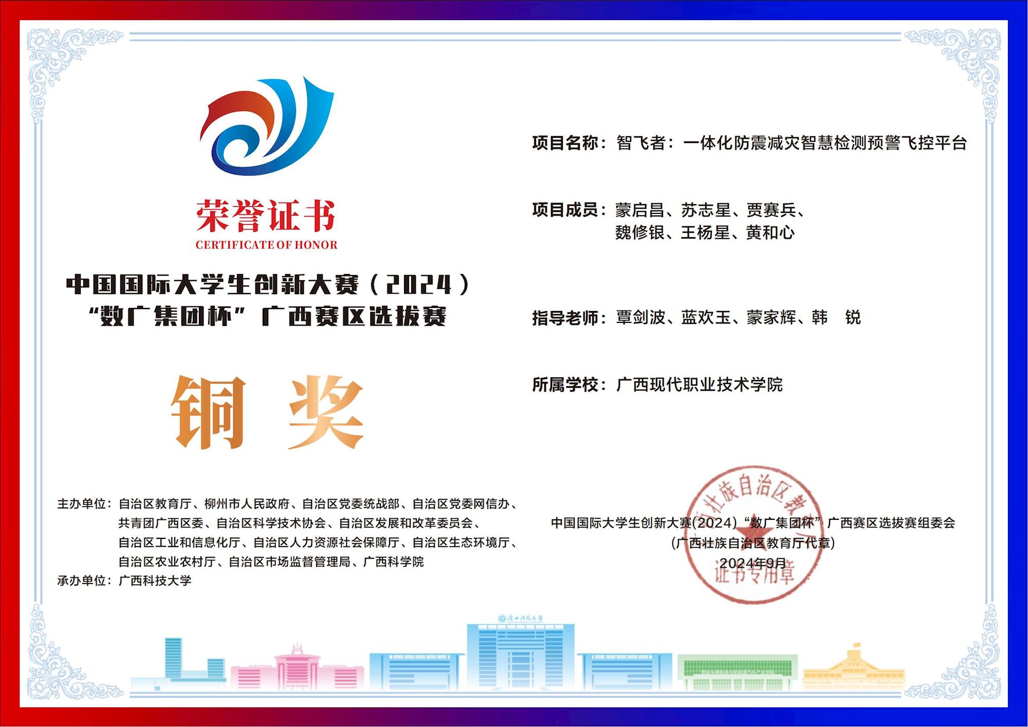 中国国际大学生创新大赛(2024) “数广集团杯”广西赛区选拔赛:我校斩获“青年红色筑梦之旅”赛道1银15铜! 来源:文/蒙贵货 图/蒙贵货 发布时间:2025-10-20 09:20:17 浏览次数: 次 【字体:小 大】 在2024年中国国际大学生创新大赛“数广集团杯”广西赛区选拔赛中,我校学子在“青年红色筑梦之旅”赛道表现卓越,斩获银奖1项、铜奖15项,以创新实力彰显职教风采! 终审:cxcyxy001 【打印正文】 相关信息