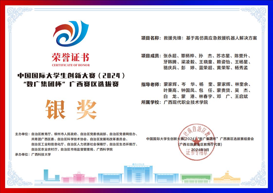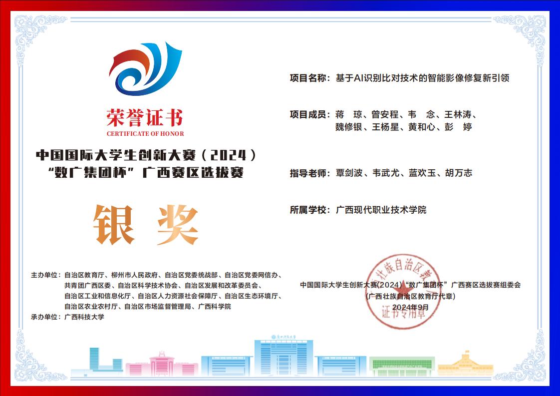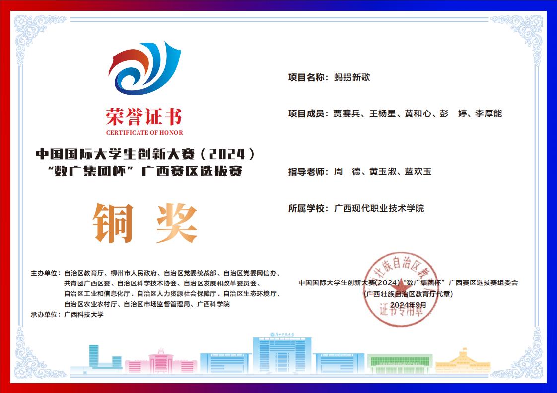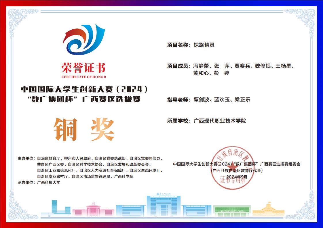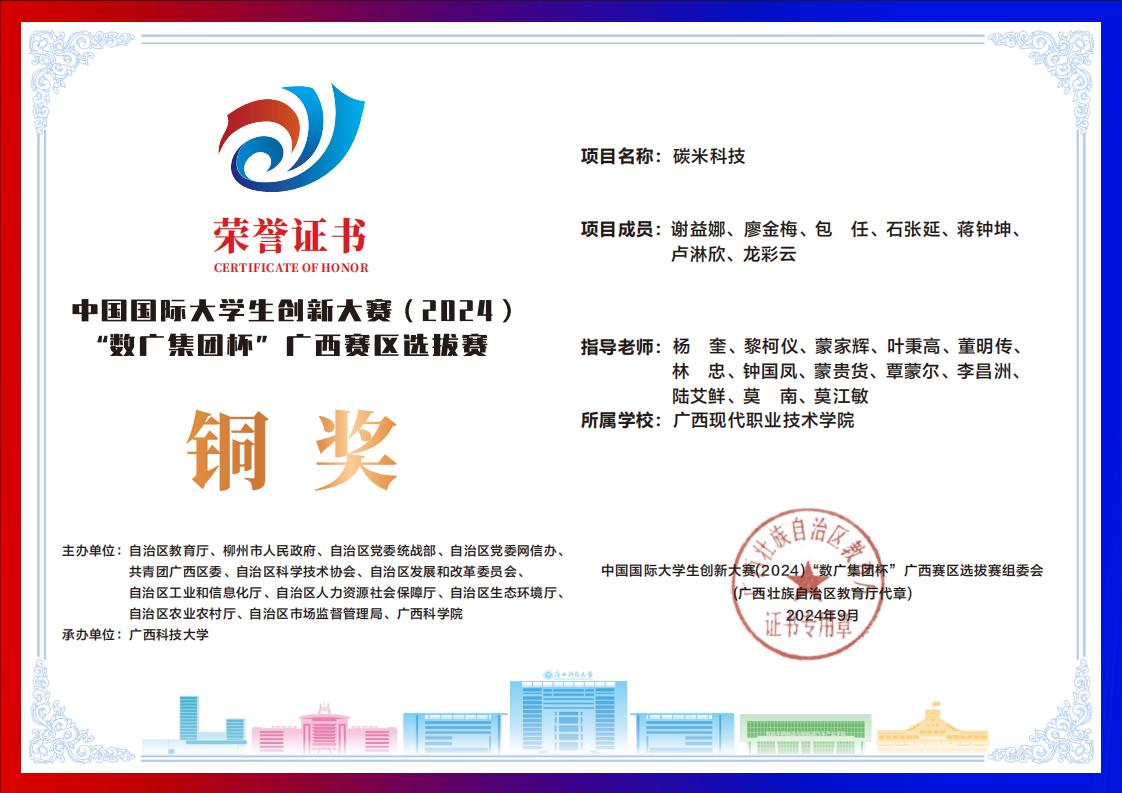 中国国际大学生创新大赛(2024) “数广集团杯”广西赛区选拔赛:我校斩获“高教主”赛道4银7铜! 来源:文/蒙贵货 图/蒙贵货 发布时间:2025-10-20 09:33:09 浏览次数: 次 【字体:小 大】 在2024年中国国际大学生创新大赛“数广集团杯”广西赛区选拔赛中,我校学子在“高教主”赛道表现卓越,斩获银奖4项、铜奖7项,以创新实力彰显职教风采! 终审:cxcyxy001 【打印正文】 相关信息