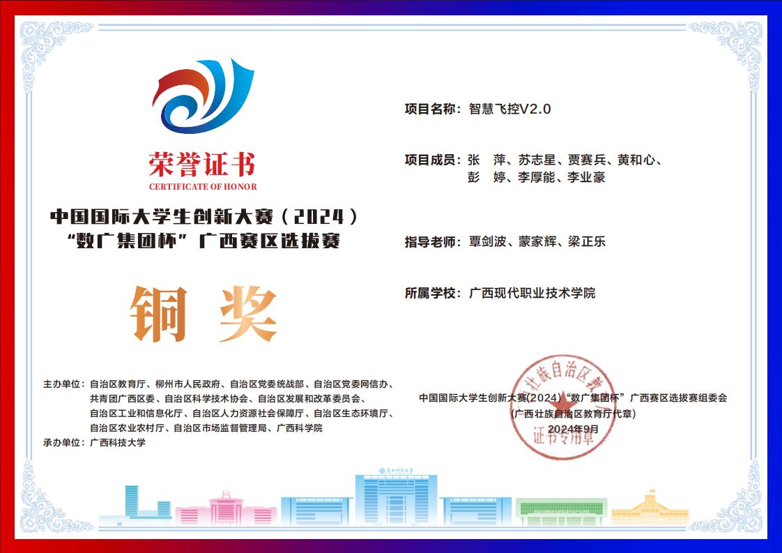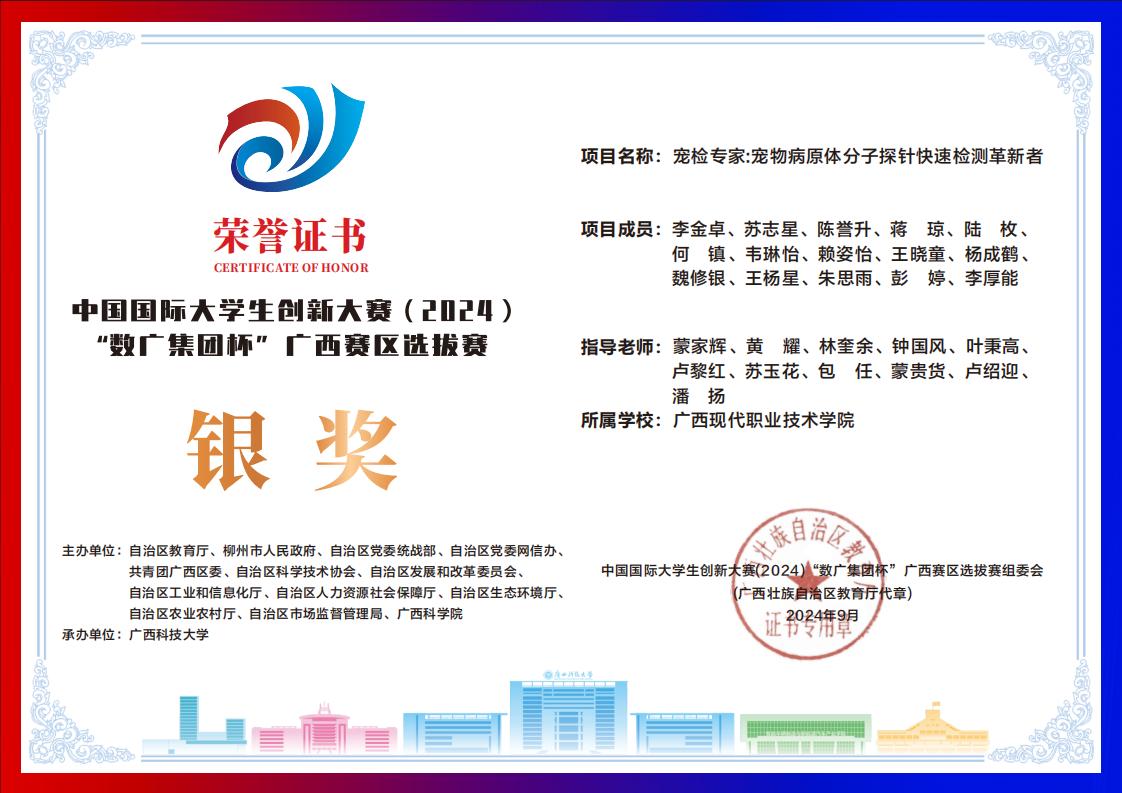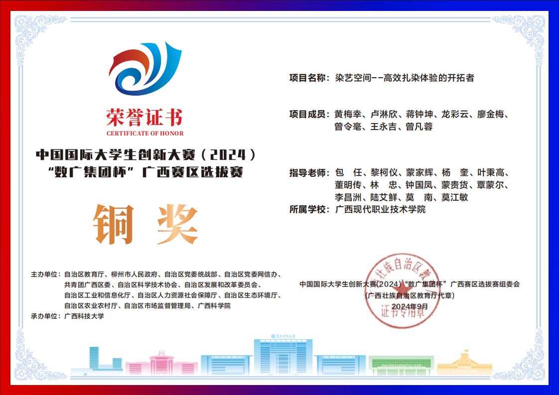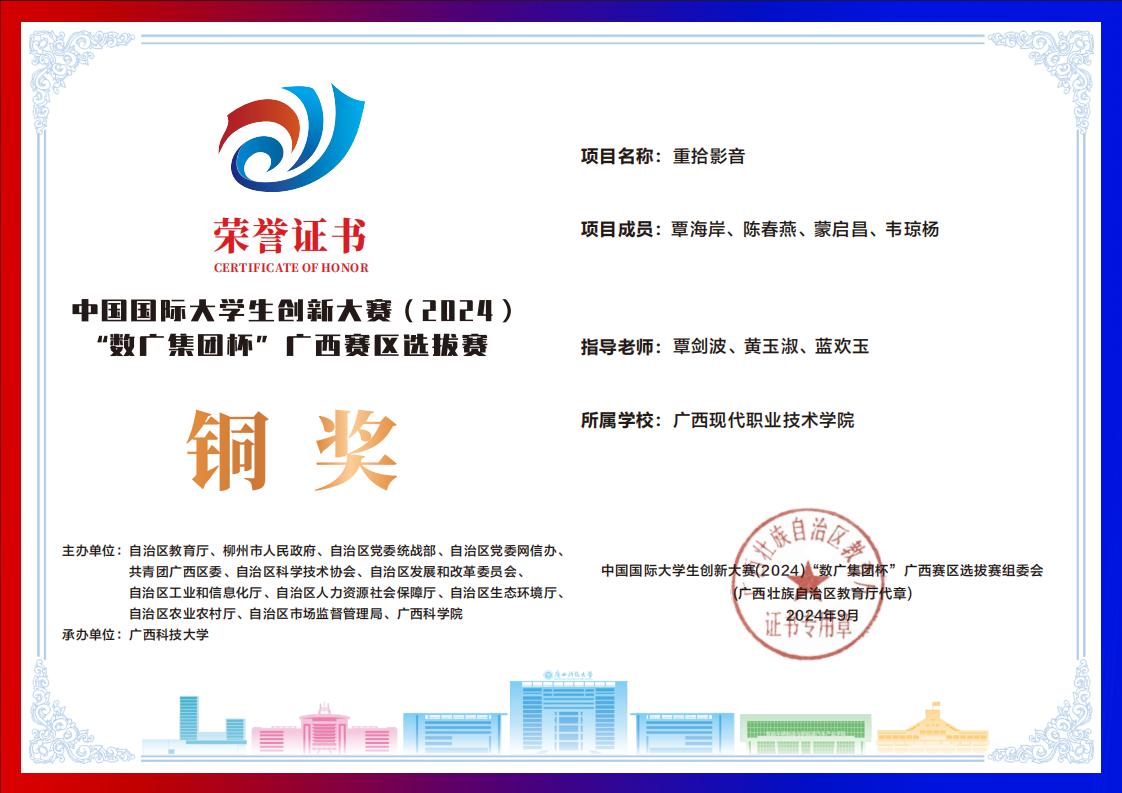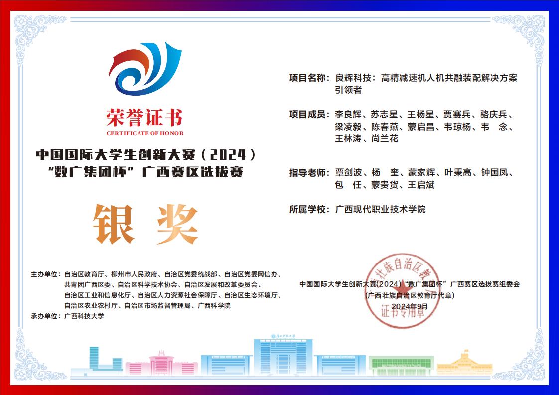 中国国际大学生创新大赛(2024) “数广集团杯”广西赛区选拔赛:我校斩获“高教主”赛道4银7铜! 来源:文/蒙贵货 图/蒙贵货 发布时间:2025-10-20 09:33:09 浏览次数: 次 【字体:小 大】 在2024年中国国际大学生创新大赛“数广集团杯”广西赛区选拔赛中,我校学子在“高教主”赛道表现卓越,斩获银奖4项、铜奖7项,以创新实力彰显职教风采! 终审:cxcyxy001 【打印正文】 相关信息